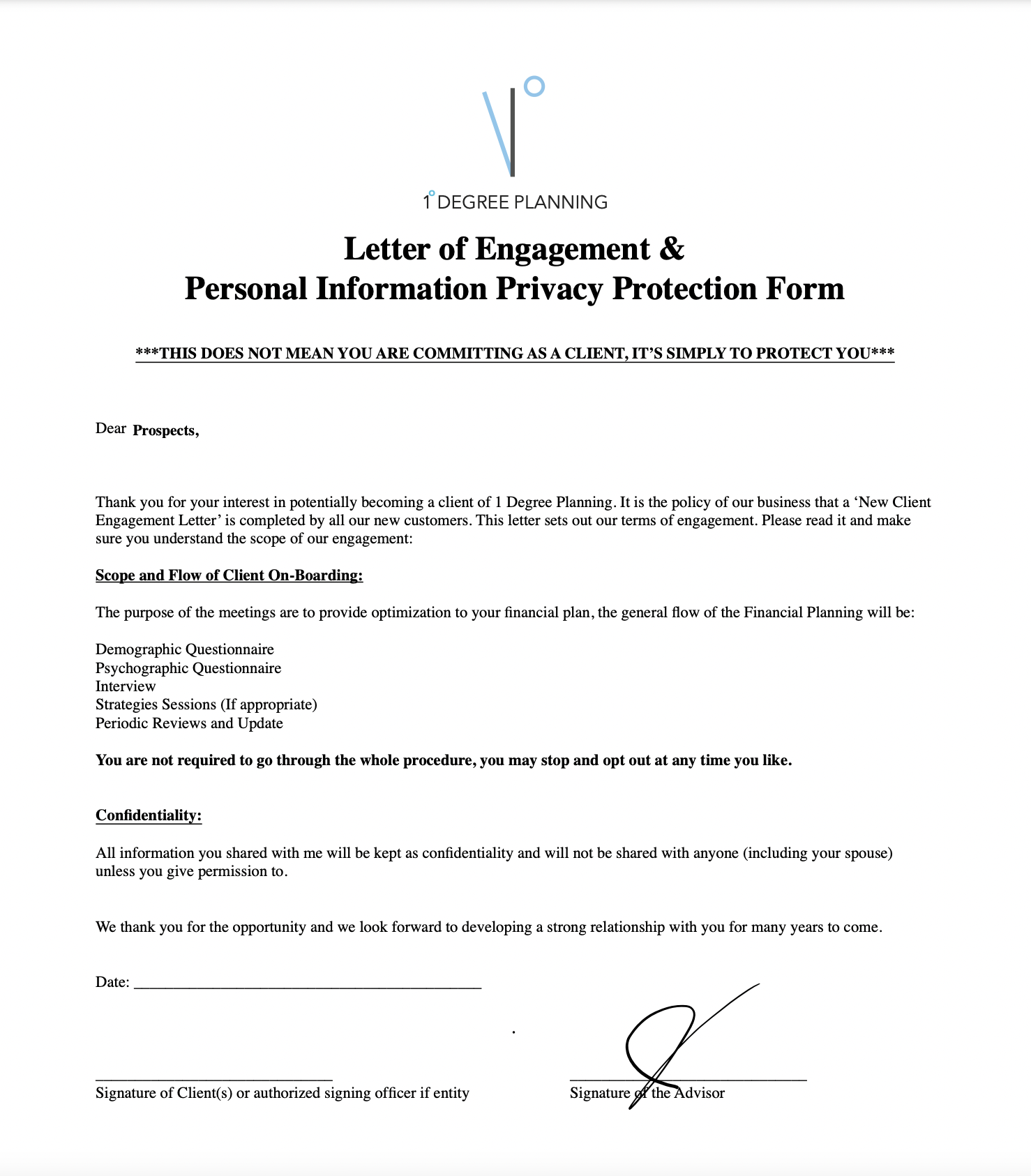 You are here because you attended our service intro session, please click button in order to get download our letter of engagement and send back to us at jacky@1degreeplanning.ca